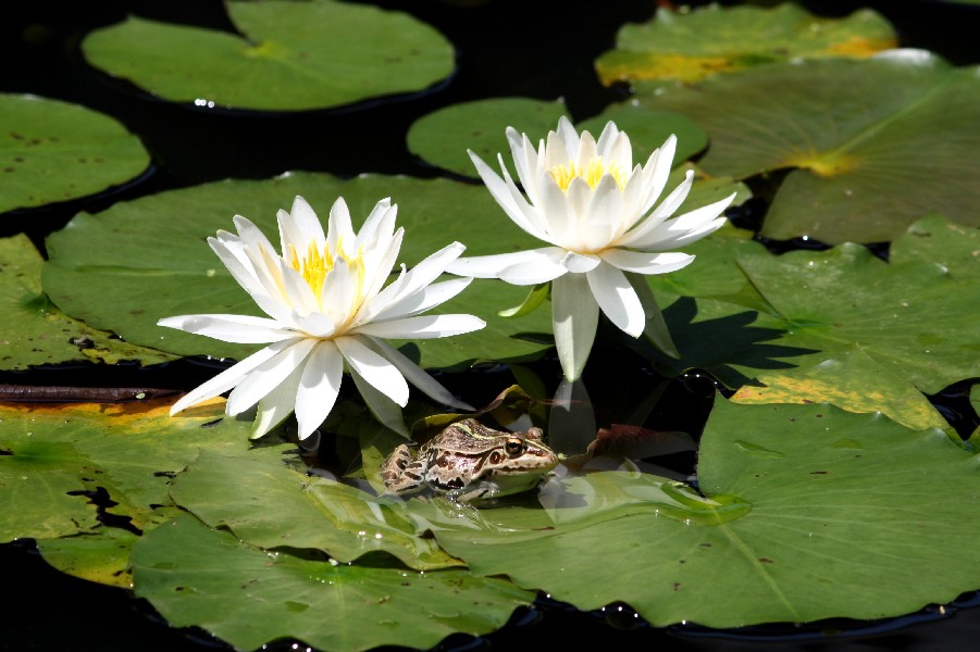 睡蓮の花の影で蛙が厳しい日差しを避けていました。