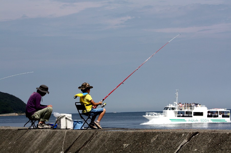 親子で釣りを楽しむ人、観潮船に乗って渦潮を楽しむ人、自然の中に身を置いて休日を楽しんでいました。