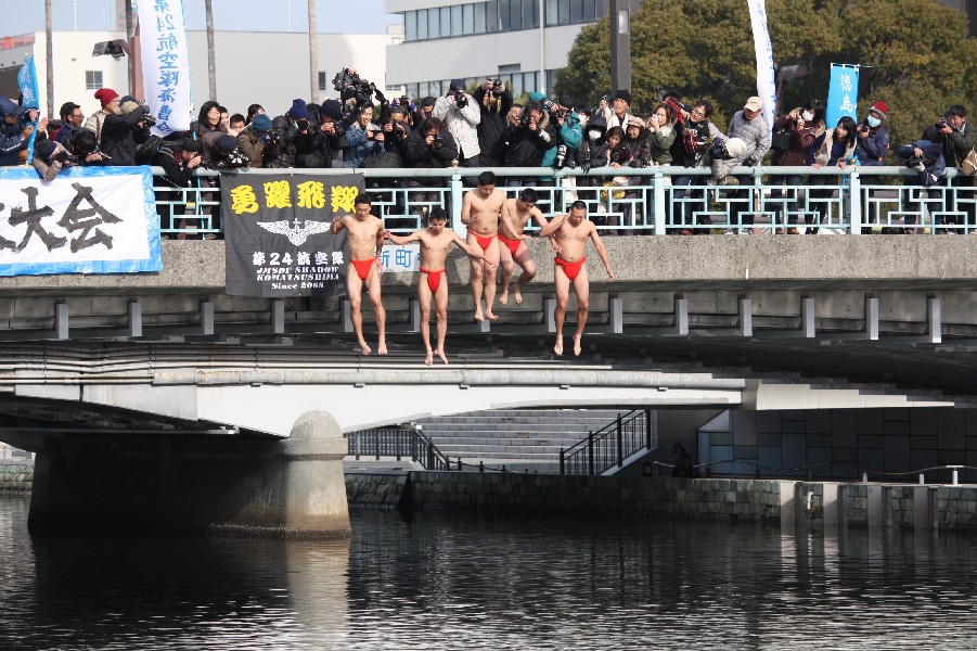 一言:一年で一番寒い時期に行われる新町川寒中水泳大会ですが、新町橋からの飛び込み、水中阿波踊りと見物客を飽きさせません。 最近は水中皿回しも加わり、寒さを忘れてしまうほど楽しい行事になりました。