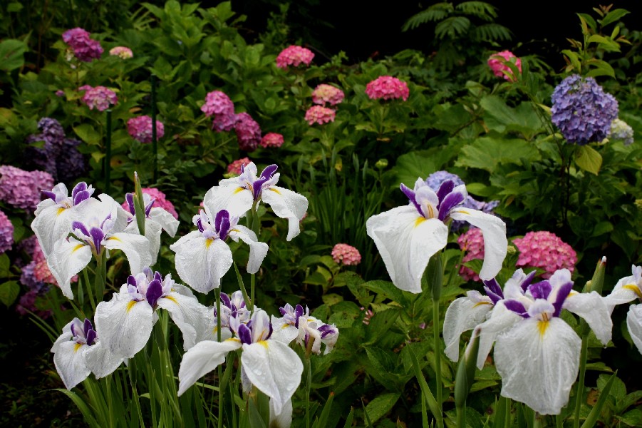 一言:熊谷寺には約500株のアジサイが植えられており、梅雨時のお遍路さんを出迎えます。 アジサイに混じって花菖蒲も咲いていました。 まさに梅雨時の代表的な花の競演でした。 雨もまた楽しです。