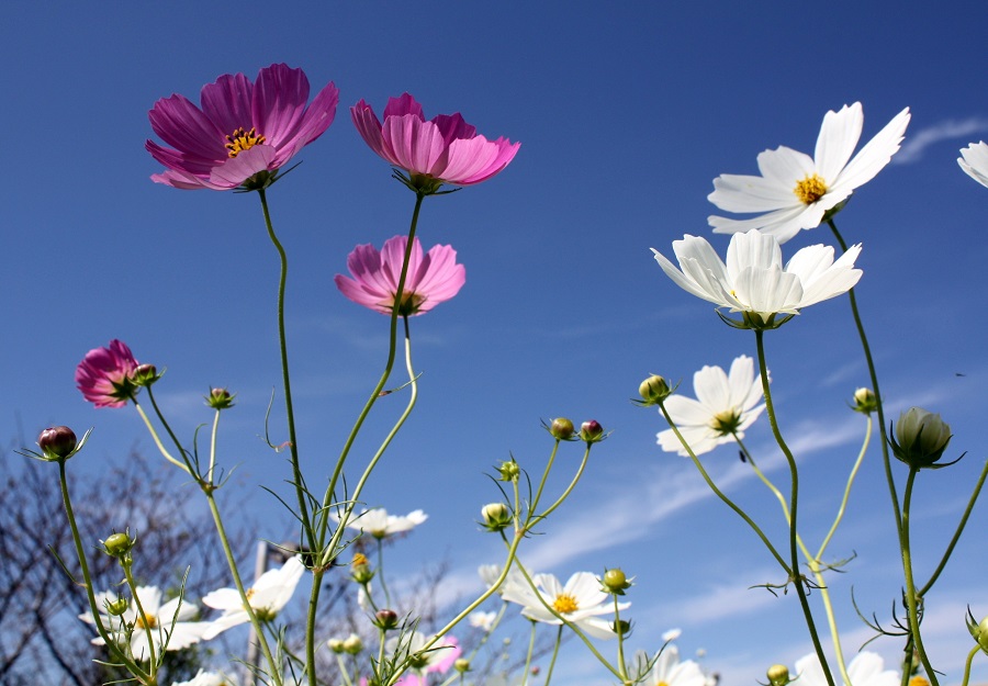 一言:何気なく花言葉を調べてみました。 赤いコスモスは「愛情」「調和」、白いコスモスは「優美」らしいです。 そんな気持ちで一つ一つの花を見るのも楽しいものです。秋晴れの青空に似合う花です。