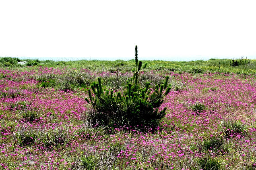 一言:梅雨といっても毎日雨が降るわけではありません。晴れ間を見つけて海へ出かけました。 砂浜を歩いていると、何やら見慣れぬ風景に出会いました。小さな花が一面に広がって、ピンクの絨毯のようでした。 一本一本は小さくても、たくさん集まると大きな風景を生み出します。