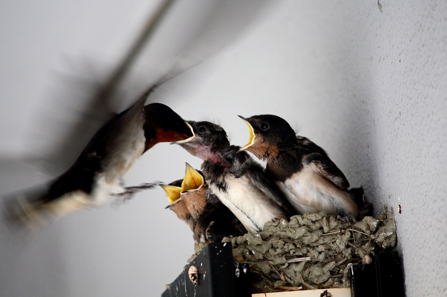 一言:知人から「ツバメの子が4羽いる」との連絡を頂き、知人宅に早速出かけました。 何枚撮っただろうか。偶然にも子に餌を与える瞬間を捉えることが出来ました。 大きく口をあけた子に親が餌を与えています。 命が繋がれて行くのを目の当たりにしました。