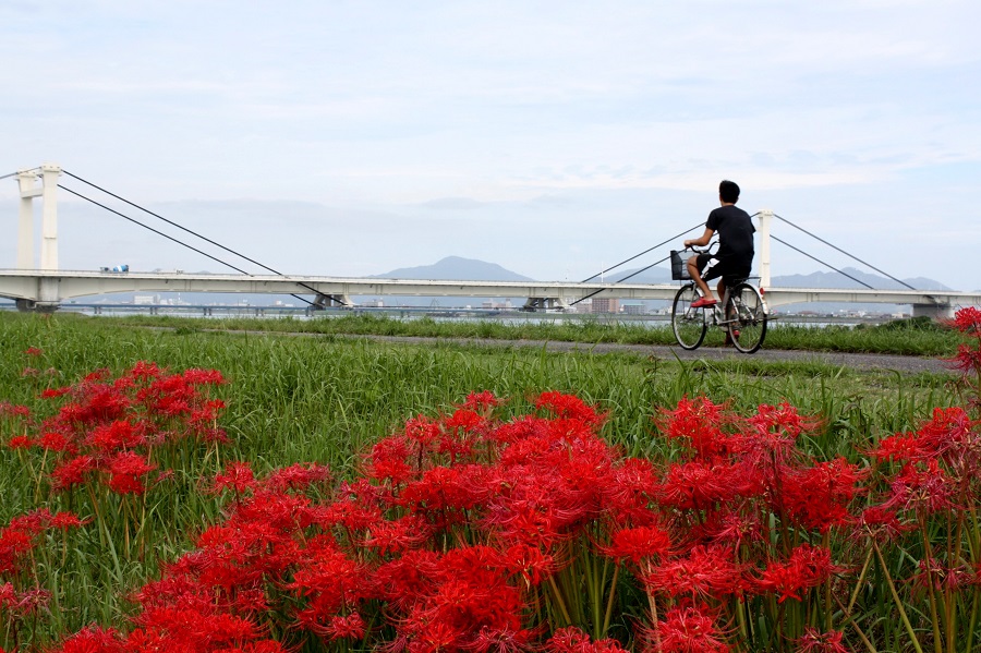 一言:徳島県は橋の宝庫と言われています。 全国的にも珍しい型式の「しらさぎ大橋」を見ながら、散歩、ジョギング、サイクリングと、 堤防はさまざまな楽しみ方で利用されています。