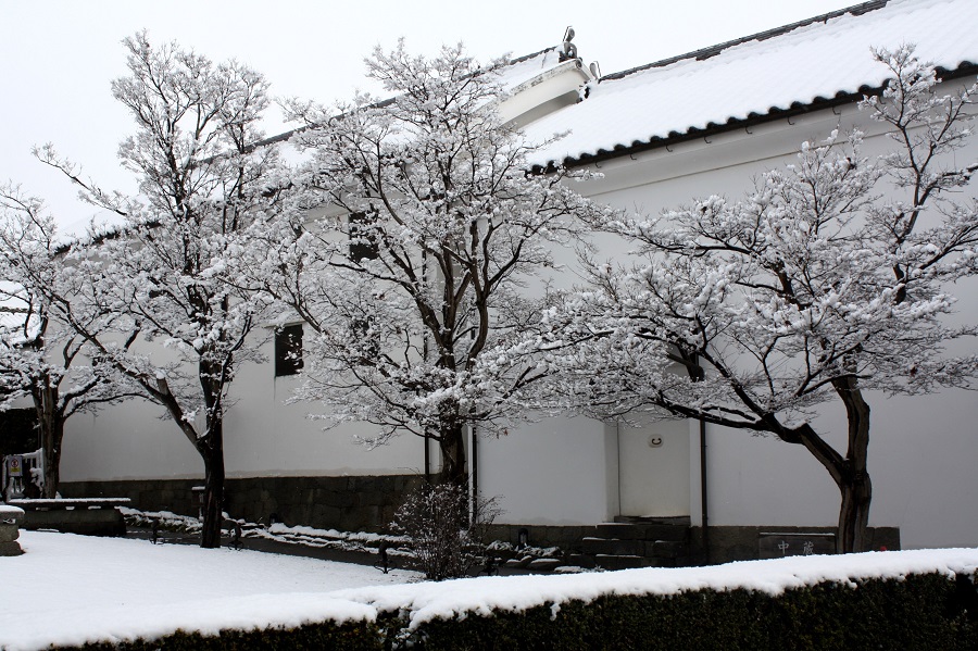 一言:県西部に大雪が降りました。 うだつの町並みでは一番有名な吉田家住宅の南側に白い藍蔵があります。 蔵に沿って植えられたモミジも雪化粧です。一面に白い世界が広がっていました。
