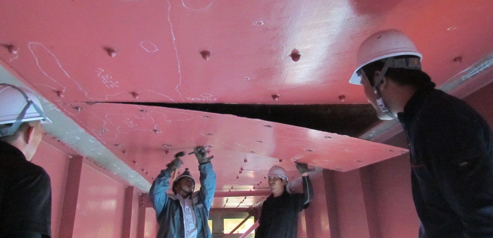 上記写真は、橋の詳細調査時においてRC床版下面の調査を行うため、床版補強鋼板を一時撤去している様子です。